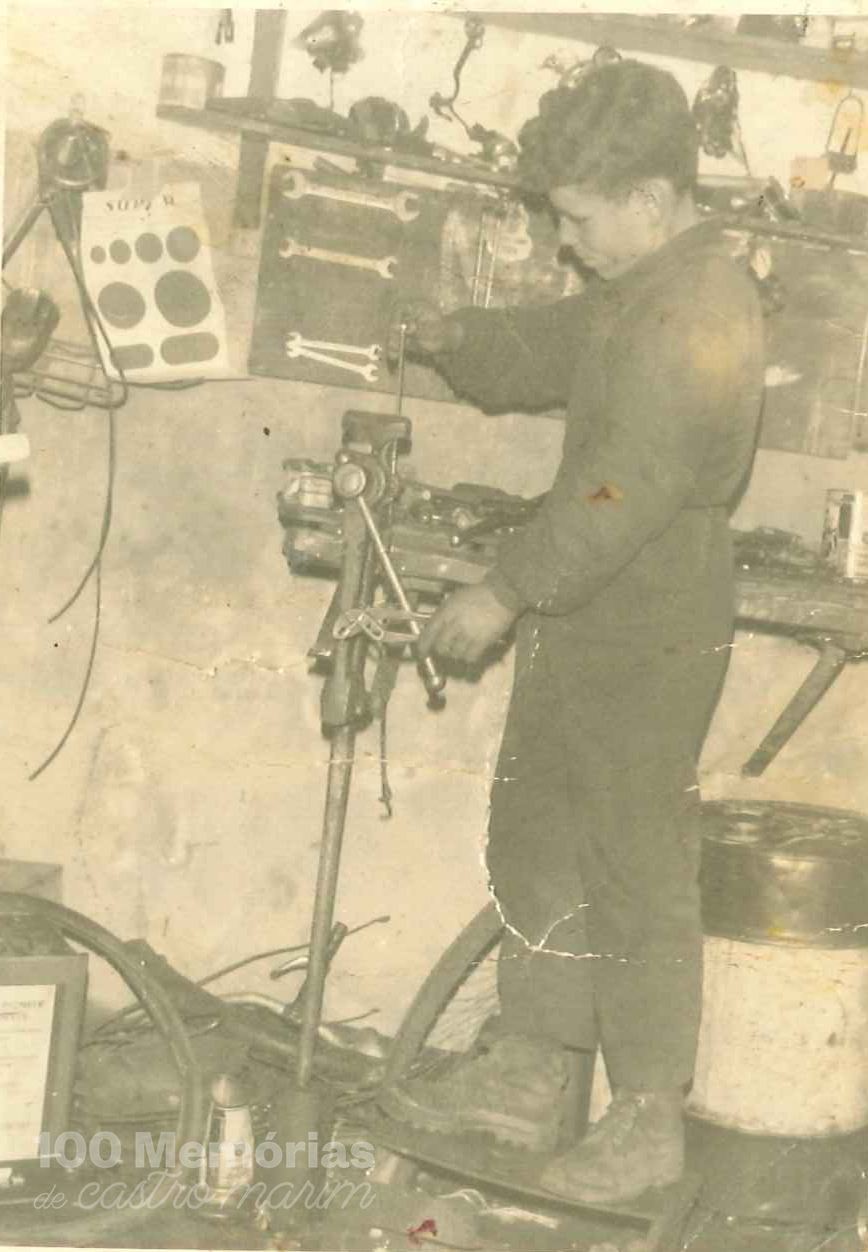 João Bandarra a trabalhar na oficina do Joaquim das Bicicletas, 1964, Helena Bandarra