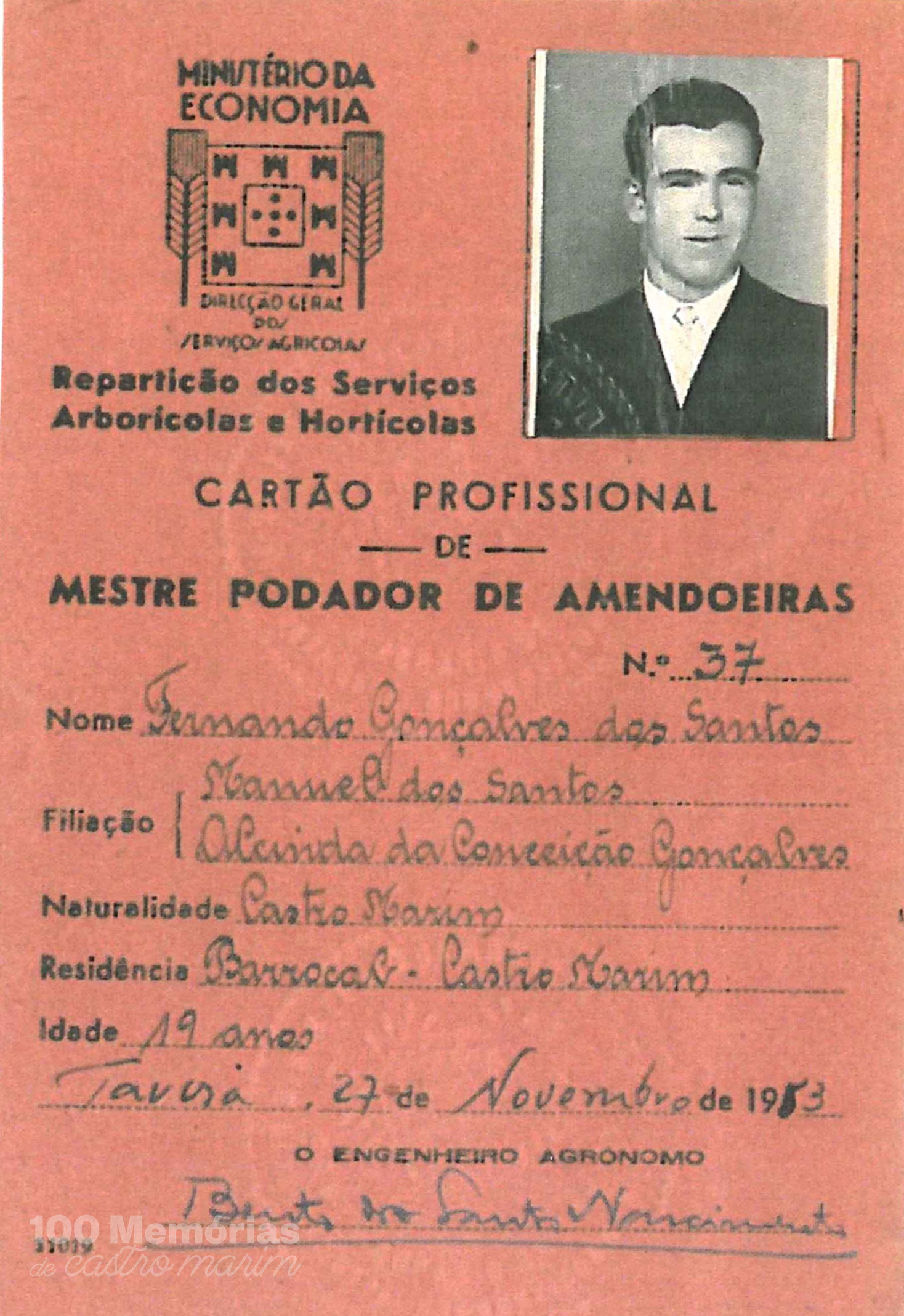 Cartão Profissional de Mestre Podador de Amendoeiras, 1953, Junta de Freguesia de Castro Marim