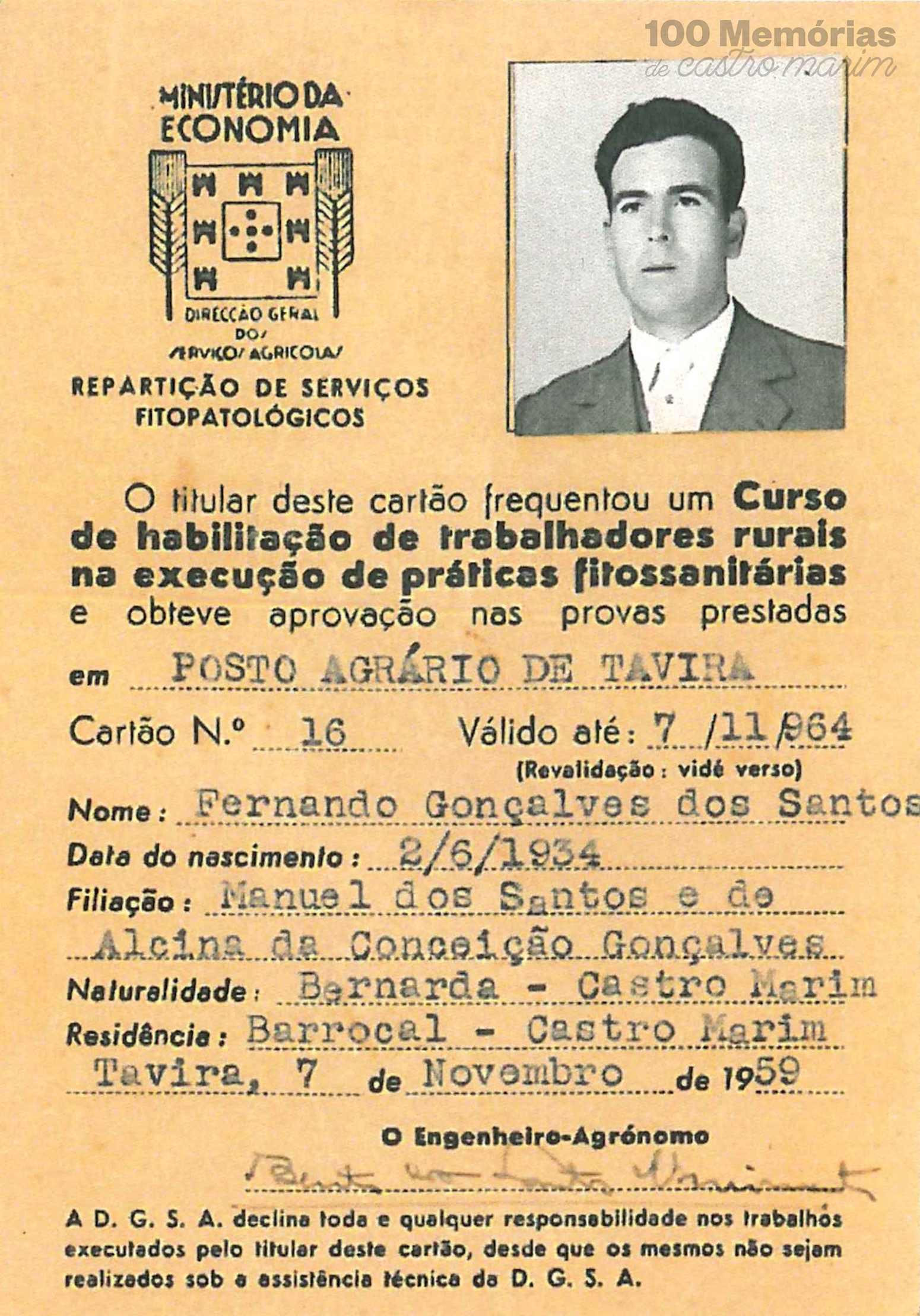Certificado de habilitação de trabalhadores rurais na execução de práticas fitossanitárias, 1959, Junta de Freguesia de Castro Marim